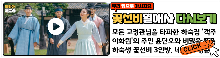 꽃선비 열애사 총 18부작으로 제작이 되었으며, 매주 월/화 SBS 오후 10시에 방영이 되며 다시보기는 SBS 홈페이지, 웨이브를 통해서 보실 수 있습니다