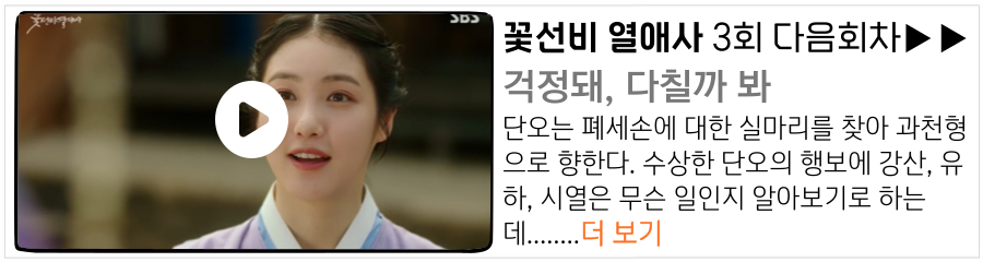 꽃선비 열애사는 신예은, 려운, 강훈, 정건주 주연으로 총 18부작이며 매주 월/화 SBS 오후 10시에 방영이 되며 다시보기는 SBS 홈페이지, 웨이브를 통해서 보실 수 있습니다 기본정보 및 등장인물 소개는 여기로▼